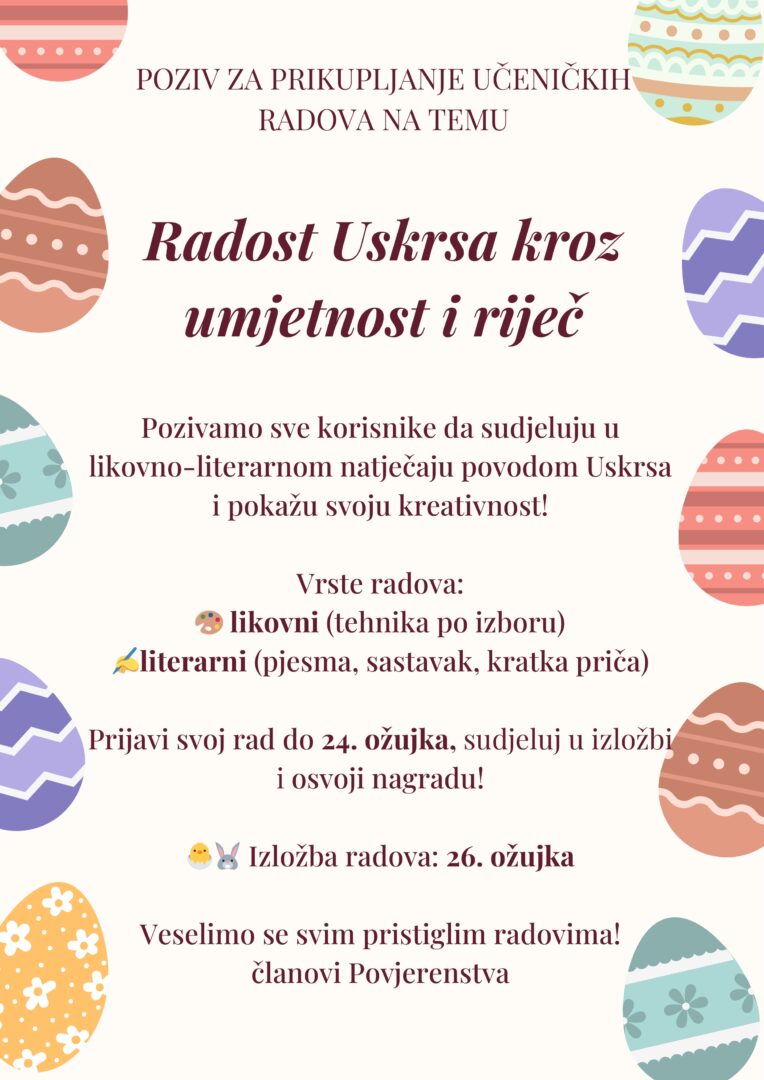 Pozivamo sve korisnike da sudjeluju u likovno-literarnom natječaju povodom Uskrsa i pokažu svoju kreativnost.